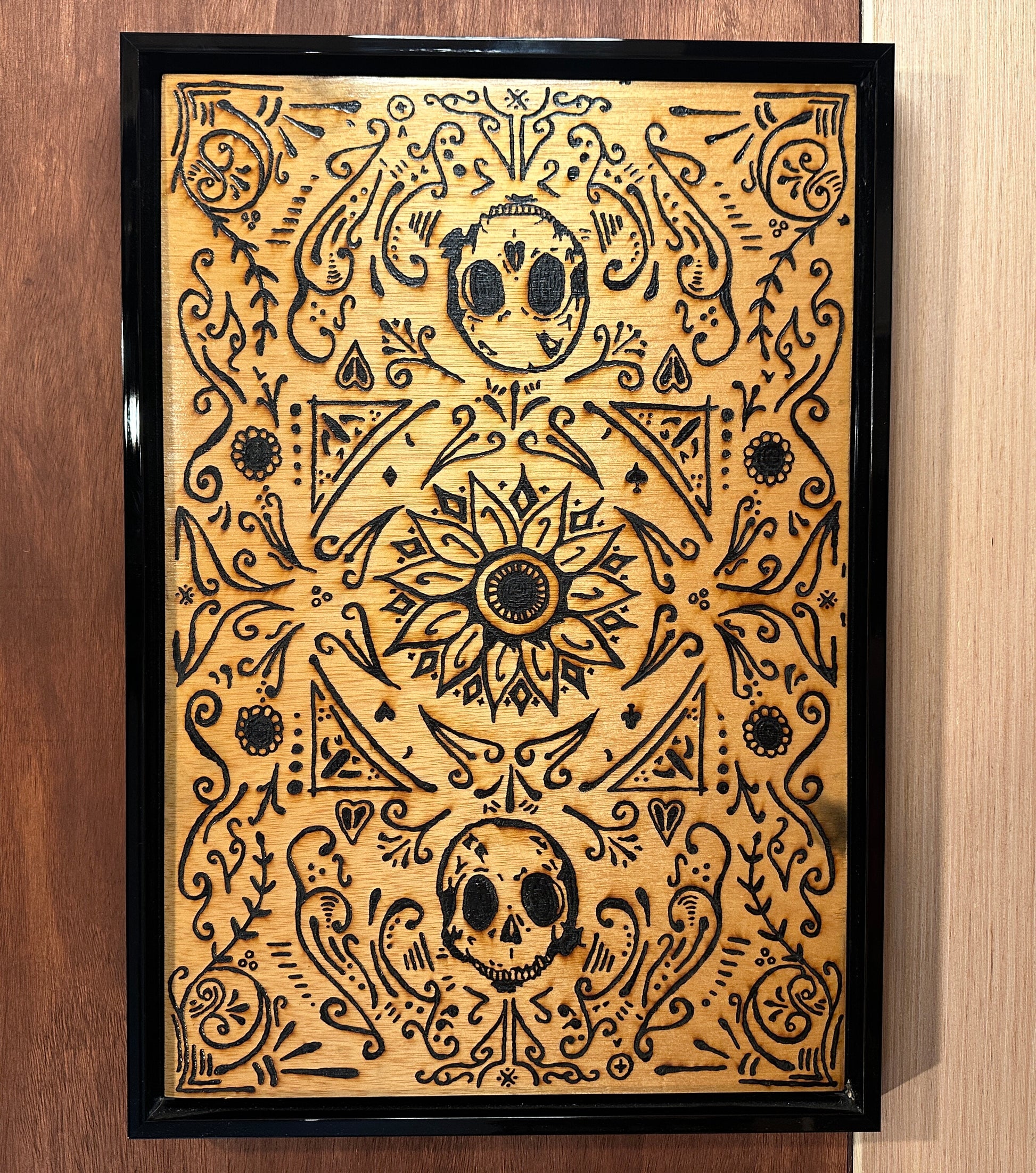Burned on maple plywood using a magnifying glass and the sun; frame was made by a professional framing service for an art show